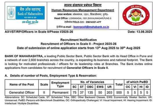 सरकारी बैंक में नौकरी का सपना देखने वाले युवाओं के लिए बड़ी खुशखबरी है। Bank of Maharashtra ने Generalist Officer Scale-II के 500 रिक्त पदों पर भर्ती का नोटिफिकेशन जारी किया है। आवेदन अप्लाई करने की प्रक्रिया 13 अगस्त 2025 से शुरू हो चुकी है और इच्छुक उम्मीदवार 30 अगस्त 2025 तक इसके ऑफिशियल बेबसाइट पर ऑनलाइन आवेदन कर सकते हैं। यह अवसर उन युवाओं के लिए काफी बेहतर है जो बैंकिंग सेक्टर में करियर बनाना चाहते हैं।